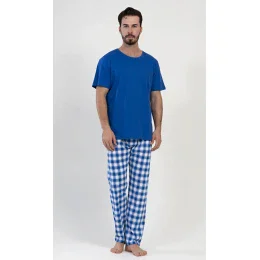 Pánske dlhé bavlnené pyžamo Karel. Pyžamo sa skladá z trička s krátkym rukávom a dlhých nohavíc. Jednofarebné tričko dopĺňajú kárované nohavice, ktoré majú elastický pás a šnúrku na stiahnutie. Nohavice nemajú vrecká. 100 % bavlnený materiál je príjemný a pružný na dotyk.