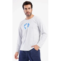 Pánské dlouhé bavlněné pyžamo Matěj. Pánské pyžamo se skládá z trika s dlouhým rukávem a dlouhých kalhot. Triko s kulatým výstřihem je jednobarevné, zdobené na hrudi obrázkem zeměkoule a nápisem 'The world is yours'. Jednobarevné kalhoty mají v pase gumu, šňůrku na stažení a praktické kapsy. Použitý materiál je poddajný a příjemný na dotek. Obsah bavlny u kalhot a modrého trika je 100%, pouze u šedého trika 70%.