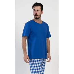 Pánské pyžamo se skládá z trička s krátkým rukávem a dlouhých kalhot. Jednobarevné tričko vhodně doplňují kostkované kalhoty..Kalhoty nemají kapsy. Použitý materiál je jemný a poddajný na dotek. Pyžamo je vhodné na denní nošení.