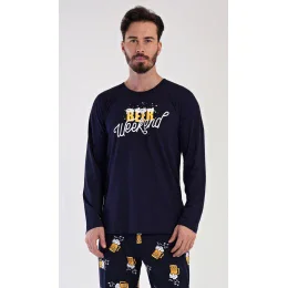 Pánske dlhé bavlnené pyžamo Víkend. Pánske pyžamo pozostáva z košele s dlhým rukávom a dlhých nohavíc. Jednofarebné tričko zdobí nápis BEER WEEKEND. Motív piva sa opakuje aj na nohaviciach. Nohavice majú elastický pás, šnúrku na stiahnutie a praktické vrecká. Použitý materiál je mäkký a pružný na dotyk. Podiel bavlny v košeli a nohaviciach je 100 %.