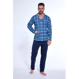 Elegantné pánske pyžamo s dlhými rukávmi a golierom, otvorený golier, vrecká na úrovni bokov. Priliehavé nohavice s rovnými dlhými nohavicami. Pyžamo v škatuli.