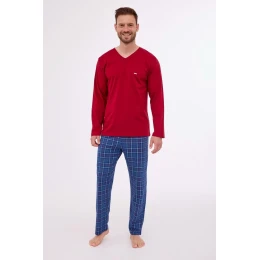 Pánske pyžamo z kvalitnej bavlny, blúzka s dlhými rukávmi a výstrihom do V, jemné náprsné vrecko, dlhé rovné kockované nohavice, balené v krabici.
