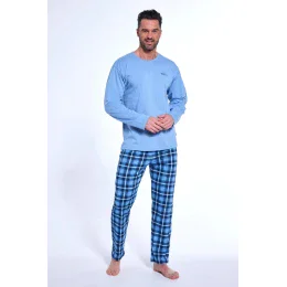 Pánske pyžamo DR 124/188 Strong 2 je štýlovou a pohodlnou voľbou na chladnejšie noci. Košeľu s dlhými rukávmi v jemnom modrom odtieni zdobí motivačný slogan "Stay Strong", ktorý jej dodáva charakter a moderný štýl. Okrúhly výstrih zaručuje pohodlie a voľnosť pohybu. Dlhé nohavice v klasickej modrej kocke, vyrobené zo 100 % bavlny, sú vzdušné, mäkké a príjemné na pokožku. Elastický pás zaručuje dokonalé prispôsobenie. Pyžamo je ideálne aj ako pohodlné domáce oblečenie. Navrhnuté a ušité v Poľsku, je vynikajúcou voľbou pre mužov, ktorí ocenia aj