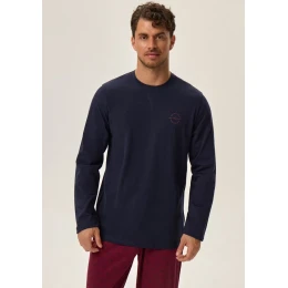 Pánské pyžamo značky Henderson. Pyžamo se skládá z trička s dlouhým rukávem, rukávy a spodní část trička je volná. Okolo krku je kulatý výstřih s pružným lemem. Na levé straně je menší nápis. Kalhoty jsou volnější, v pase jsou do pružné gumy na které je po celém odvodu nápis Henderson. Nohavice jsou ukončené volně a jsou celé potištěné.