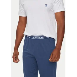 Pánské pyžamo značky Henderson. Pyžamo se skládá z trička s krátkým rukávem. Okolo krku je kulatý výstřih s pružným lemem a na levé straně je menší písmeno H. Kalhoty jsou volnější, v pase jsou do pružné gumy na které je po celém odvodu nápis Henderson. Nohavice jsou ukončené volně a jsou jednobarevné.