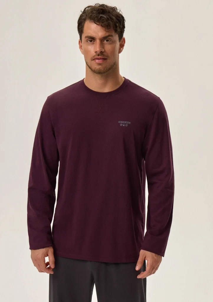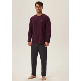 Pánske pyžamo značky Henderson. Pyžamo pozostáva z trička s dlhými rukávmi, rukávy a spodná časť trička sú voľné. Má okrúhly výstrih s elastickým lemom. Na ľavej strane je malý nápis. Nohavice sú voľné, s elastickým pásom s nápisom Henderson po celej dĺžke. Nohavice sú ukončené voľne.