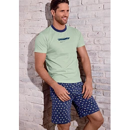 Pánske pyžamo Infiore pozostáva z pohodlného trička s krátkymi rukávmi v jemnom svetlozelenom odtieni s kontrastným tmavším výstrihom a jemnou potlačou na hrudi, ktoré dopĺňajú tmavomodré šortky s drobným vzorom. Materiál je mäkký, ľahký a priedušný, čo zaručuje maximálne pohodlie pri spánku a domácom relaxe. Šortky majú voľnejší strih a elastický pás, ktorý sa dobre prispôsobí telu a neobmedzuje v pohybe. Štýlová a pohodlná súprava na každodenné nosenie.