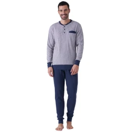 Pánske bavlnené pyžamo talianskej značky Karelpiu. Pyžamo je vyrobené zo 100 % bavlny, je veľmi pohodlné a príjemné. Košeľa má dlhé rukávy, okrúhly výstrih a zapínanie na tri gombíky. Na ľavej prednej strane je všité vrecko. Voľné nohavice majú pohodlný elastický pás, nohavice sú zakončené širokou légiou. Materiálové zloženie: 100 % bavlna.