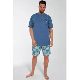 Pánske pyžamo z mäkkej kvalitnej bavlny. Tričko s krátkymi rukávmi a jemnou potlačou na hrudi. Krátke vzorované šortky. Balené v krabici.
