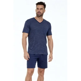 Pánske pyžamo KR 330 W/26 je klasickou a pohodlnou voľbou na teplejšie noci, ktorá spája nadčasový štýl s vysokým komfortom. Módne pruhované tričko s krátkymi rukávmi a výstrihom poskytuje elegantný, mužný vzhľad a zaručuje voľnosť pohybu. Bavlnený úplet s polyesterom je mäkký, príjemný na pokožku a odolnejší voči deformácii.