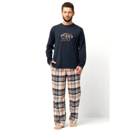 Pánske pyžamo je kombináciou pohodlia, štýlu a kvality. Vrchný diel je tmavomodrá mikina s dlhými rukávmi zdobená originálnou etnickou potlačou býka, ktorá jej dodáva jedinečný charakter. Nohavice v módnej kocke v odtieňoch krémovej, hnedej a tmavomodrej farby sú vyrobené z teplého, mäkkého bavlneného flanelu, ktorý je ideálny na chladnejšie noci. Voľný strih a elastický pás zaručujú voľnosť pohybu a plný komfort spánku. Ideálna voľba pre mužov, ktorí ocenia pohodlie a originálny dizajn.