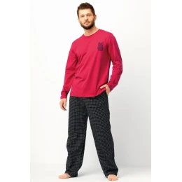 Pánska pyžamová súprava MNS 471 B25 je pohodlná súprava vyrobená výlučne z prírodnej, priedušnej bavlny. Blúzka s dlhými rukávmi a okrúhlym výstrihom bola ozdobená zaujímavou potlačou sovy, ktorá dodáva celej súprave jedinečný charakter. Mäkké flanelové nohavice v klasickom károvanom vzore majú rovný strih nohavíc a praktické bočné vrecká. Elastický pás podšitý bavlnou zaručuje pohodlné nosenie a voľnosť pohybu. Ide o ideálnu voľbu pre mužov, ktorí oceňujú prírodné materiály, praktickosť a nádych originality v každodennom domácom oblečení.