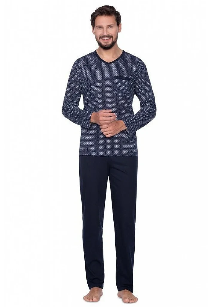 Pánské bavlněné pyžamo značky Regina. Pyžamo je vyrobeno ze 100% bavlny. Toto pánské pyžamo má pro vyšší komfort výstřih do tvaru V, dlouhý rukáv a dlouhé nohavice bez úpletů. Pyžamo je doplněno náprsní kapsičkou.