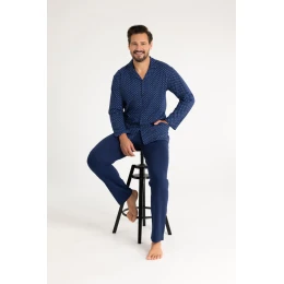 Piżama męska 486 BIG J/25 marki Regina to klasyczny model o eleganckim, ponadczasowym charakterze. Górna część piżamy to rozpinana koszula z długim rękawem, kołnierzykiem oraz wzorem w kratę. Na wysokości bioder znajdują się praktyczne kieszenie, które zwiększają funkcjonalność piżamy. Do zestawu dołączone są jednolite spodnie z prostymi nogawkami, zapewniające komfort i swobodę ruchów. Całość wykonana została z wysokogatunkowej, 100% bawełny, która jest miękka, oddychająca i przyjazna dla skóry. To idealna piżama na chłodniejsze noce – stylowa, praktyczna i niezwykle wygodna.
