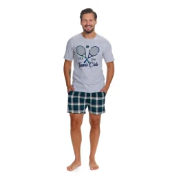 Zestaw składa się z koszulki z krótkim rękawem, której przód zdobi kolorowy nadruk, nadający piżamie nowoczesnego i swobodnego charakteru. Do kompletu dołączone są krótkie spodenki w kratę, wyposażone w praktyczne kieszenie, które zwiększają funkcjonalność i wygodę użytko: