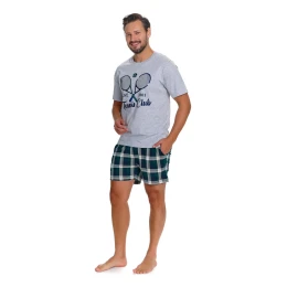 Zestaw składa się z koszulki z krótkim rękawem, której przód zdobi kolorowy nadruk, nadający piżamie nowoczesnego i swobodnego charakteru. Do kompletu dołączone są krótkie spodenki w kratę, wyposażone w praktyczne kieszenie, które zwiększają funkcjonalność i wygodę użytko: