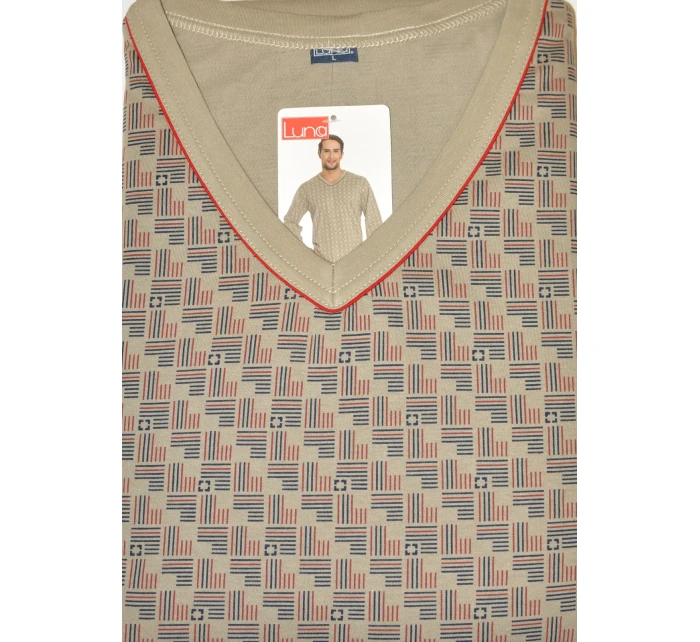 Tričko je vzorované s dlouhým rukávem a dekoltem do V. Kalhoty jsou dlouhé, jednolité a barevně vyladěné.