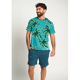 Pánske pyžamo Muydemi vo výraznom letnom štýle pozostáva z trička s krátkymi rukávmi a šortiek v rovnakých odtieňoch teal. Tričko má okrúhly výstrih a zdobí ho výrazná potlač palmy v kontrastnej žltozelenej farbe, ktorá modelu dodáva tropický a svieži vzhľad. Šortky sú jednofarebné, majú pohodlný strih a elastický pás, ktorý zaručuje skvelé prispôsobenie a maximálne pohodlie pri nosení. Ľahký a príjemný materiál je ideálny na spanie a pobyt doma počas teplejších nocí.
