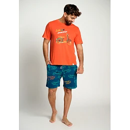 Pánske pyžamo Muydemi v hravom a výraznom dizajne pozostáva z trička s krátkymi rukávmi v sýtej oranžovej farbe, ktoré dopĺňajú šortky s potlačou v tmavomodrozelenom odtieni. Tričko má okrúhly výstrih a zdobí ho farebný motív kolobežky so sloganom "Life is a journey" (Život je cesta), ktorý modelu dodáva uvoľnený a letný charakter. Šortky majú pohodlný strih, elastický pás a zdobí ich opakujúci sa vzor kolobežiek v kontrastných farbách, vďaka čomu pôsobia moderne a hravo. Ľahký a príjemný materiál zaručuje maximálne pohodlie pri spaní a nosení doma počas teplých dní.