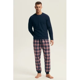 Piżama męska NOIR 43457 to ponadczasowa propozycja na chłodniejsze wieczory. Góra z długim rękawem i zapięciem na guziki typu henley w granatowym kolorze doskonale współgra z klasycznymi spodniami w czerwono-granatową kratę. Wykonana w 100% z wysokiej jakości bawełny, zapewnia komfort termiczny i przewiewność. Elastyczna talia ze sznurkiem i ściągacze w nogawkach sprawiają, że piżama idealnie dopasowuje się do sylwetki.