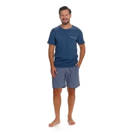 Piżama męska PMB.7424 BIG DR NAP w kolorze Denim Blue to klasyczny, ponadczasowy komplet stworzony z myślą o komforcie snu i domowego wypoczynku. Wykonana z wysokogatunkowej dzianiny (71% bawełna, 26% poliester, 3% elastan), jest miękka, przyjemna dla skóry i zapewnia wygodę przez całą noc. Gładki T-shirt w odcieniu denim blue z subtelnym logo Doctor Nap na piersi posiada swobodny, komfortowy krój. Spodenki w delikatne paseczki nadają całości lekko sportowego charakteru. Ozdobna guma w pasie z logo marki gwarantuje idealne dopasowanie i nowoczesny wygląd, a praktyczne kieszonki po bokach zwiększają funkcjonalność zestawu. Piżama została starannie uszyta w Polsce z dbałością o każdy detal. Model dostępny również w wersji damskiej – idealny do stworzenia rodzinnego kompletu.