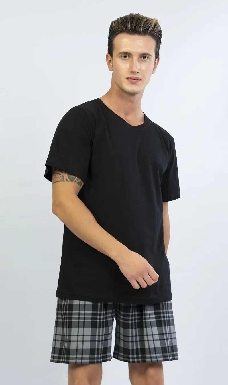 Pánske bavlnené pyžamové šortky Aleš. Pánske pyžamo pozostáva z trička s krátkym rukávom a krátkych šortiek. Jednofarebné tričko s okrúhlym výstrihom dopĺňajú kárované nohavice v príjemných tlmených farbách. Nohavice sú bez vreciek, majú elastický pás a šnúrku na stiahnutie. 100 % bavlnený materiál je príjemný a poddajný na dotyk.