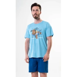 Pánské pyžamo šortky Boss. Pánské pyžamo šortky Boss se skládá z trička s krátkým rukávem a krátkých šortkových kalhot. Na tričku je obrázek medvěda odpočívajícího v křesle s nápisem Im the Boss of my House. Výrazné tričko vhodně doplňují jednobarevné šortky. Použitý materiál je jemný a poddajný na dotek. Pyžamo je vhodné na denní nošení.