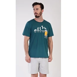 Pánske pyžamové šortky Filip. Pánske pyžamo pozostáva z trička s krátkym rukávom a krátkych šortiek. Jednofarebné tričko s okrúhlym výstrihom zdobí veselý obrázok malých chlapcov, ktorí sa s blížiacim sa víkendom nevedia dočkať pohára piva. Tričko dopĺňajú jednofarebné šortky s elastickým pásom a šnúrkou na stiahnutie. Nemajú vrecká. Použitý materiál je príjemný a pružný na dotyk. Podiel bavlny v tričku je 100 % a v šortkách 70 %. Pyžamo je vhodné aj na každodenné nosenie.