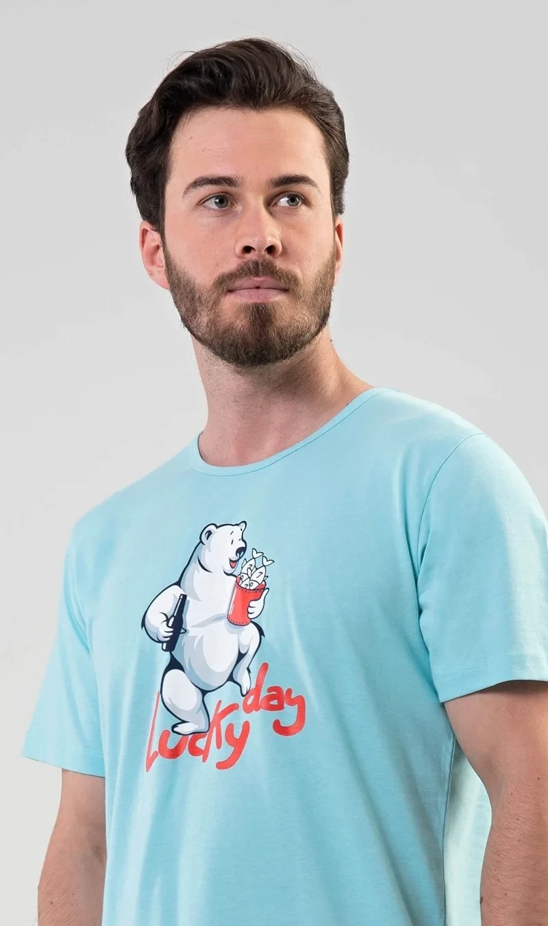 Pánske bavlnené pyžamové šortky Lucky day. Pánske pyžamo sa skladá z trička s krátkym rukávom a krátkych šortiek. Jednofarebné tričko s okrúhlym výstrihom má nápis LUCKY DAY a obrázok veselého ľadového medveďa. Tričko dopĺňajú jednofarebné šortky, ktoré majú elastický pás a šnúrku na stiahnutie. Nemajú vrecká. Použitý materiál je príjemný a pružný na dotyk. Podiel bavlny na tričku a šortkách je 100 %. Pyžamo je vhodné na každodenné nosenie.