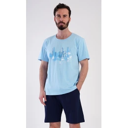 Pánské bavlněné šortkové pyžamo Bruno. Pánské pyžamo se skládá z trička s krátkým rukávem a krátkých šortkových kalhot. Jednobarevné tričko zdobí obrázek zátoky ve velkoměstě. Šortky mají praktické kapsy, v pase gumu a šňůrku na stáhnutí. Použitý materiál s podílem bavlny 100% je příjemný a poddaný na dotek. Pyžamo oceníte obzvlášť v horkých letních dnech.