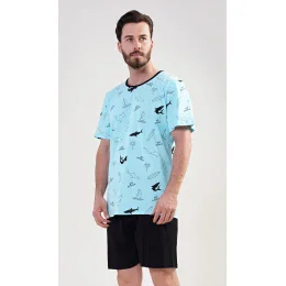 Pánske bavlnené pyžamové šortky Ocean. Pánske pyžamové šortky sa skladajú z trička s krátkymi rukávmi a krátkych šortiek. Tričko je potlačené loďami, žralokmi, palmami a logom Big Attack. Farebné tričko dopĺňajú jednofarebné šortky. Šortky nemajú vrecká, majú elastický pás a šnúrku na stiahnutie. 100 % bavlnený materiál je príjemný a pružný na dotyk. Pyžamo je vhodné aj na každodenné nosenie.