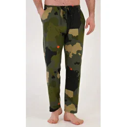 Pánske bavlnené pyžamové nohavice Marek. Pyžamové nohavice majú elastický pás, šnúrku na stiahnutie a praktické vrecká. Sú vhodné aj na každodenné nosenie ako domáce nohavice. Tkanina zo 100 % bavlny s armádnou potlačou je mäkká a hebká na dotyk.