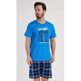Pánske bavlnené pyžamové šortky California. Pánske pyžamo sa skladá z trička s krátkym rukávom a krátkych šortiek. Na tričku je obrázok karavanu so surfovacím prknom a nápisom "California". Tričko dopĺňajú kárované šortky, ktoré majú elastický pás a šnúrku na stiahnutie, ale nemajú vrecká. Použitý materiál zo 100 % bavlny je príjemný a pružný na dotyk.