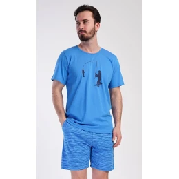 Pánske bavlnené pyžamo s rybárskymi šortkami. Pánske pyžamo sa skladá z trička s krátkym rukávom a krátkych šortiek. Jednofarebné tričko s okrúhlym výstrihom má na hrudi obrázok rybára. Tričko dopĺňajú šortky s potlačou vlnitých pruhov, ktoré majú elastický pás, šnúrku na stiahnutie a praktické vrecká. 100 % bavlnený materiál je príjemný a pružný na dotyk.