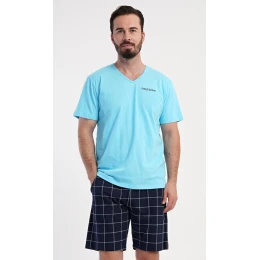 Pánske bavlnené šortkové pyžamo Freedom. Pánske pyžamo sa skladá z trička s krátkym rukávom a krátkych šortiek. Tričko s okrúhlym výstrihom zdobí malý nápis FREEDOM na hrudi. Tričko dopĺňajú kárované šortky, ktoré majú elastický pás, šnúrku na stiahnutie a praktické vrecká. 100 % bavlnený materiál je príjemný a pružný na dotyk.