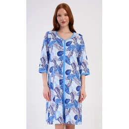Dámské bavlněné domácí šaty s tříčtvrtečním rukávem Julie. Pohodlné rozepínací šaty v příjemné délce pod kolena využijete téměř při všech volnočasových aktivitách. Mají praktické kapsy a zapínání na zip. Šaty jsou potištěny listy. Použitý bavlněný materiál je příjemný a poddajný na dotek.