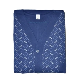 Blúzka pyžama má dlhé rukávy, pohodlné vrecká a zapínanie na gombíky. Dlhé nohavice sú jednofarebné. Dostupné farby, ktoré sa vyberajú náhodne: grafitová, džínsová.