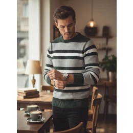 Tento klasický pánsky pruhovaný sveter je nevyhnutným doplnkom na chladnejšie dni. Je vyrobený z príjemného materiálu a poskytuje pohodlie a teplo počas celého dňa. Vďaka štýlovej farebnej kombinácii sa sveter skvele hodí k rôznym outfitom - od ležérnych až po elegantnejšie. Je mimoriadne jemný na dotyk, ideálny na každodenné nosenie, do práce alebo na stretnutie s priateľmi a hodí sa k džínsom a chinos nohaviciam, čím získa jedinečný vzhľad.
