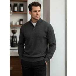Sweter dobrze współgra z T-shirtem lub koszulą, tworząc uporządkowany, męski look. Dzięki stójce zapinanej na guziki zyskuje subtelny, elegancki akcent, który pozostaje wygodny i niewymuszony. Model sprawdzi się w stylizacjach weekendowych, biznesowych i codziennych.