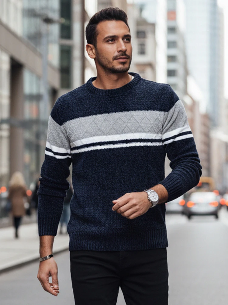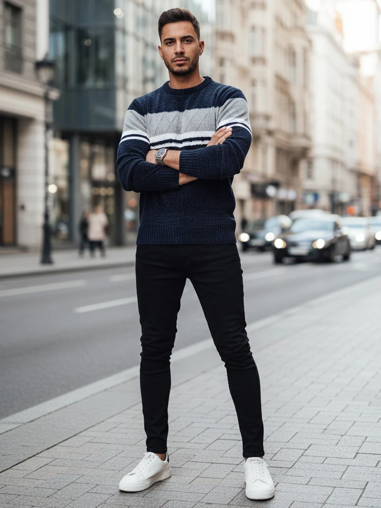 Ten sweter to idealne połączenie stylu i komfortu. Dzięki szerokim paskom na klatce piersiowej i rękawach, świetnie wyróżnia się w każdej stylizacji. Wykonany z miękkiej i ciepłej tkaniny, która zapewnia wygodę przez cały dzień. Doskonały wybór na chłodniejsze dni, gdy chce się wyglądać modnie i czuć się komfortowo.
