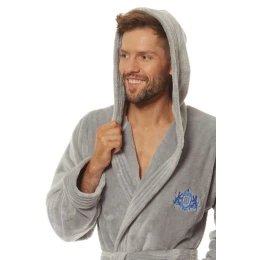 Pánský župan klasického střihu 2110 Costa L&L - z měkké tkaniny velmi příjemné na dotyk - na hrudi má malou nášivku - zavazuje se v pase páskem - na bocích našité kapsy - s kapucí - délka do poloviny stehen