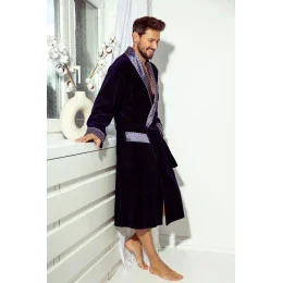 Pánsky velúrový župan s golierom, v podväzkovom páse na zaviazanie a dvoma našitými vreckami na bokoch a jednou na hrudi. Manžety, golier a vrecká sú zakončené vzorovaným saténom.: