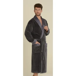 Pánský velurový župan s límcem, v Podvazkový páse na zavázání a dvěma našitými kapsami na bocích a jednou na hrudi. Manžety, límec a kapsy jsou zakončené vzorovaným saténem.