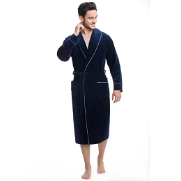 Pánsky župan značky Dorota. Župan je vyrobený z príjemného, teplého velúrového materiálu. Župan má širší golier okolo krku, ktorý je lemovaný svetlým lemom, ktorý pokračuje po bokoch županu. Lem je všitý okolo rukávov a vreciek županu. Župan má všité vrecká, má opasok, ktorý drží na všitých pútkach. Župan je dlhý do polovice lýtok.