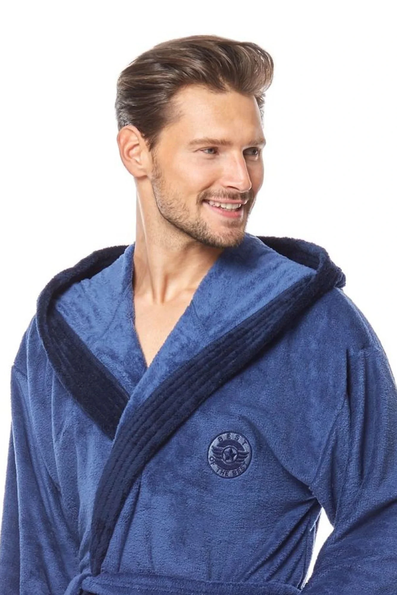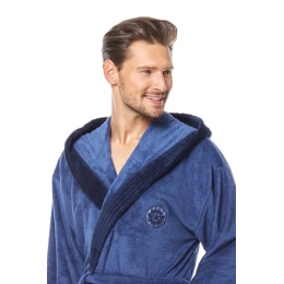 Pánský župan klasického střihu George L&L - na hrudi má malou nášivku - světle modrá barva s tmavě modrým lemováním - bez zapínání, zavazuje se v pase páskem - na bocích jsou našité kapsy - s kapucíMateriálové složení: 100% polyester