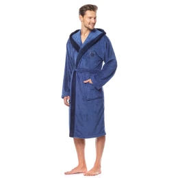 Zaujímavý hladký župan s kapucňou v atraktívnom odtieni modrej farby. Dobre sedí, zaväzuje sa v páse, má dve vrecká na bokoch a je lemovaný kontrastným lemom, ktorý mu dodáva zaujímavý charakter. V hornej časti má aplikáciu. Poľský výrobok, vysoká kvalita.