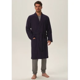 Štýlový pánsky župan značky Henderson. Tento veľmi pohodlný bavlnený župan má pohodlnú dĺžku pod kolená, zaväzuje sa v páse. Na bokoch sú všité vrecká a okolo krku golier.