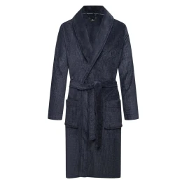 Hřejivý pánský župan od značky Henderson. Je jemný a pohodlný. Župan má šálový límec, na hrudi elegantní výšivku a v pase je na utažení. Po celé ploše má vzor malých kosteček. Délka sahá po kolena. Po stranách má dvě kapsy. Materiálové složení: 100% polyester