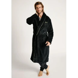 Pánsky župan Muydemi v čiernej farbe je vyrobený z mäkkého a hrejivého materiálu, ktorý poskytuje maximálne pohodlie pri domácom relaxe. Zdobí ho jemný geometrický vzor v reliéfe a kontrastné žlté lemovanie na golieri, ktoré dodáva moderný vzhľad. Župan má praktický strih so šálovým golierom, dvoma vreckami a pásom na jednoduché zaväzovanie. Na hrudi je vyšité logo MDM. Ideálna voľba pre mužov, ktorí hľadajú kombináciu elegancie, pohodlia a funkčnosti.