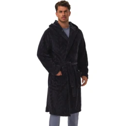 Tento hrejivý pánsky župan značky Henderson má kapucňu, elegantnú výšivku na hrudi a zaväzovanie v páse. Je dlhý po kolená a má dve vrecká na bokoch.
